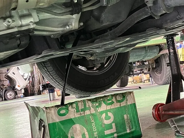 リフトアップされたハイエースの下でスタッフが手際よく作業を進めていきます。
