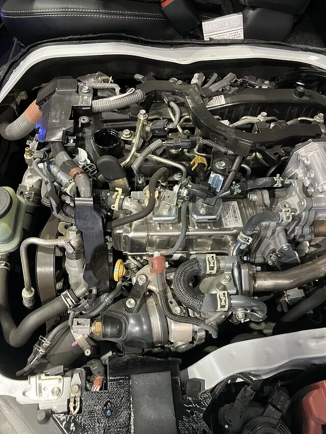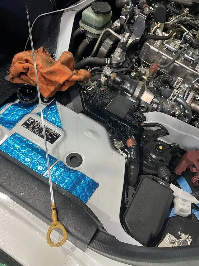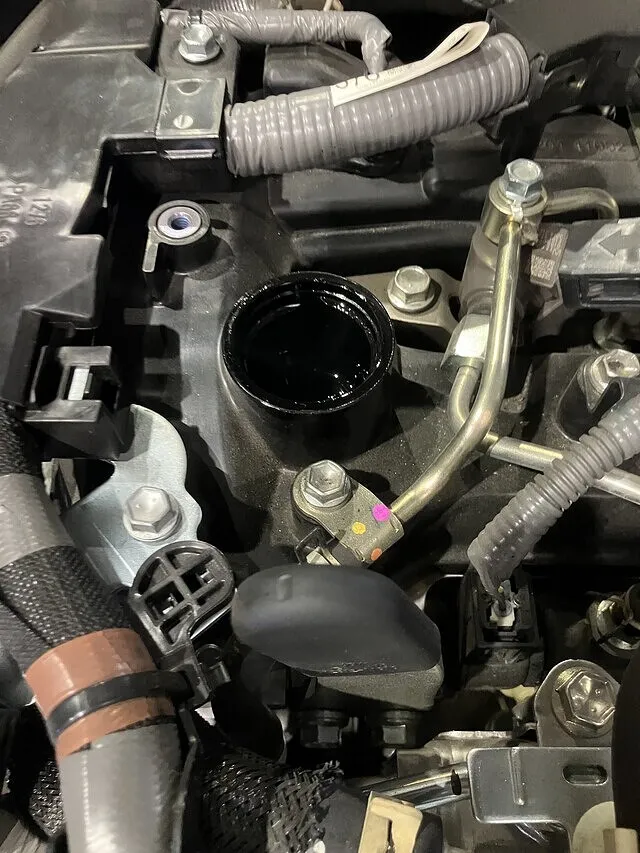 こちらの写真は、エンジンルーム内でオイルキャップを取り外し、エンジンオイルを注ぐ準備をしている様子です。