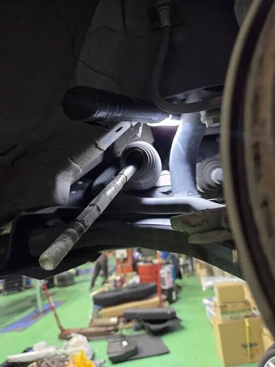 現場では、ラックブーツの交換作業を手際よく進めていきます。